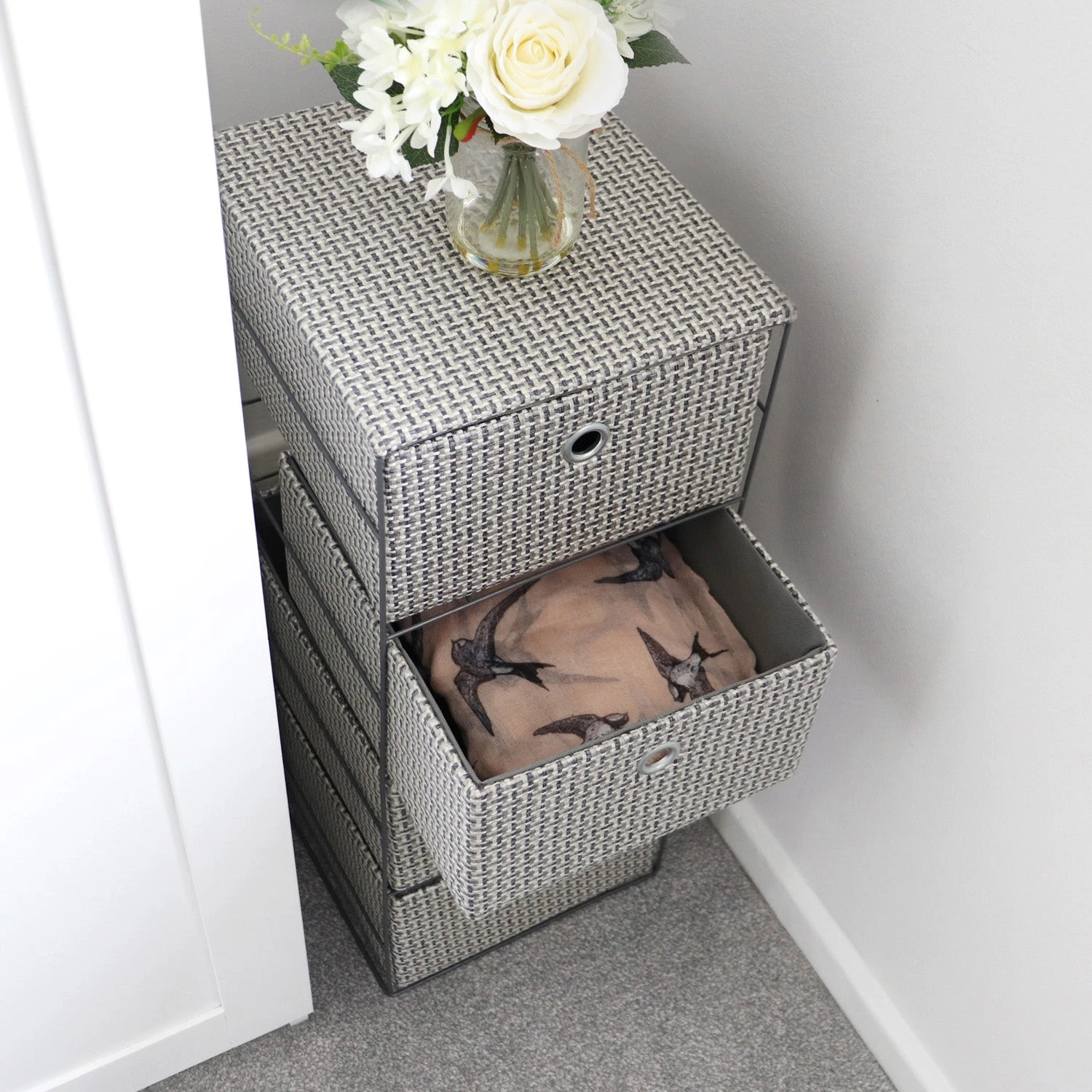 This wide storage tower is designed to fit with your household decoration, and is really versatile, ideal for small garments, jewellery, make up and more.