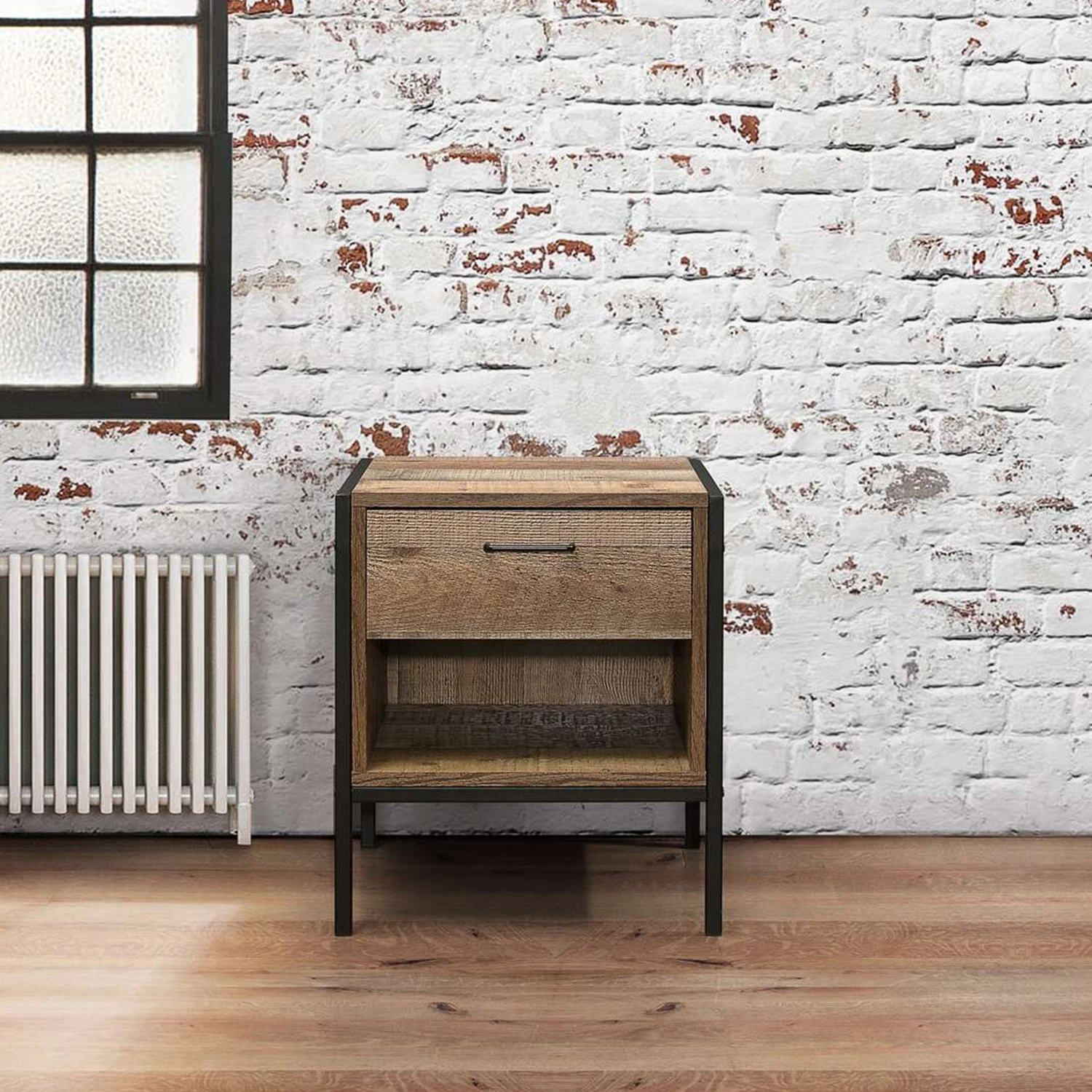 The Urban 1 Drawer Bedside features a handy drawer and internal shelf ideal for storing away any belongings. This versatile range is crafted from a metal frame with industrial-effect detail and has a wood-effect finish.