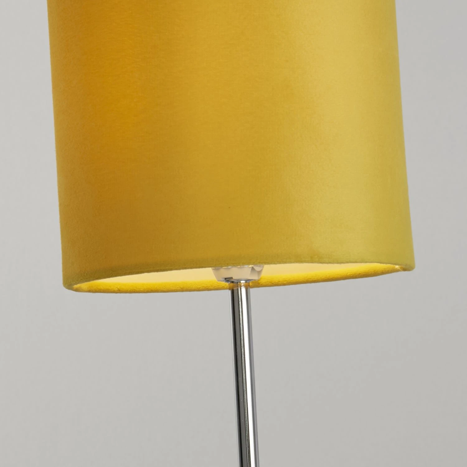 With its cylindrical design, the vibrant mustard shade atop a sleek chrome base brings a stylish touch to any room, while its slender appearance ensures suitability for various spaces.