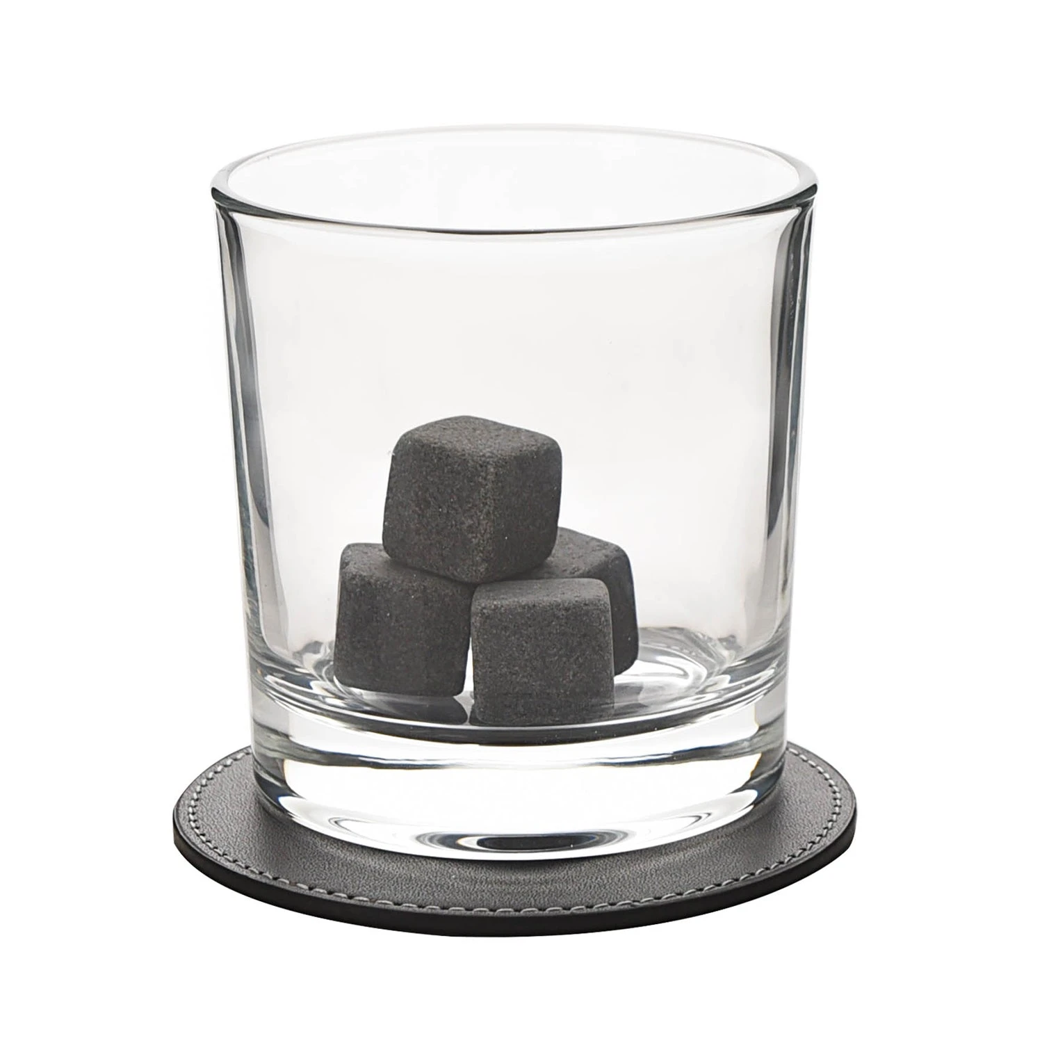 Inside you’ll find a set of two whiskey tumblers, coasters, tongs and reusable stone ice cubes.