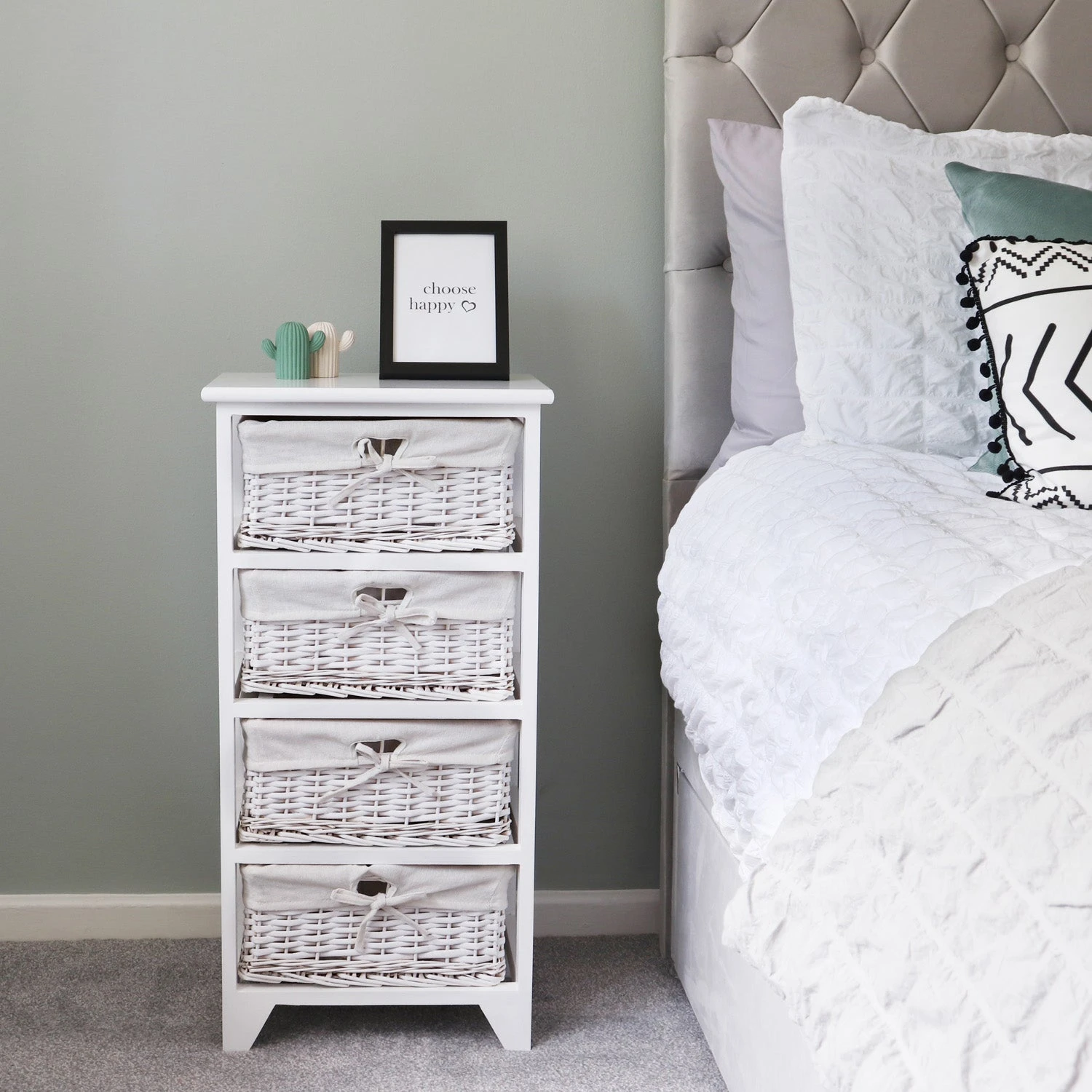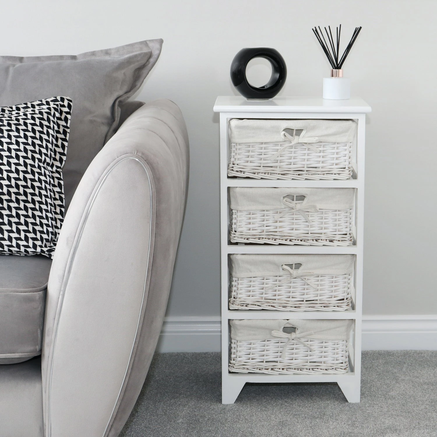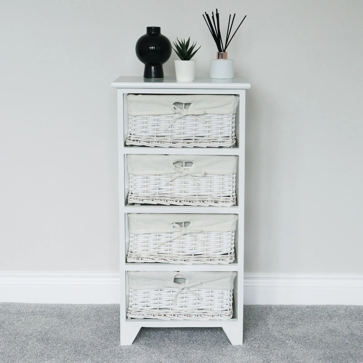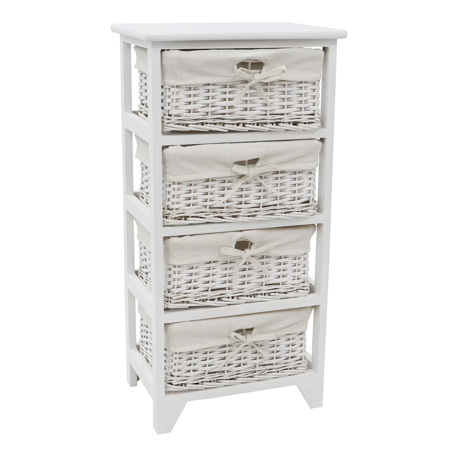 Storage is an important part of any home and the Wimborne four-drawer storage unit is an ideal solution. The four woven willow baskets have a white cotton liner with a tie front bow, while the frame is made from wood with a white satin finish, making it ideal for your living area.