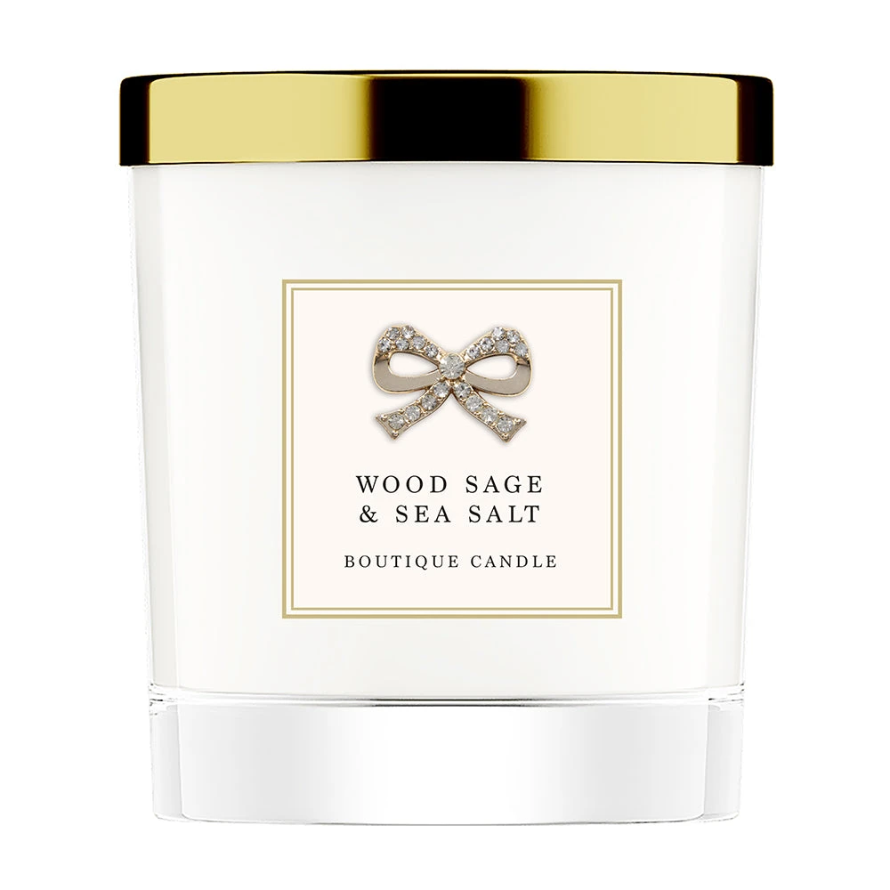 Indulge in this Wood Sage and Sea Salt Scented Candle presented in a glass jar designed with a gold diamante bow and a luxurious gold lid. Packaged in a matching box, this is the perfect gift for someone special.